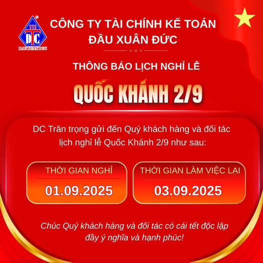 Công ty Tài Chính Kế Toán Đầu Xuân Đức (DC) xin thông báo đến Quý Khách hàng, đối tác và toàn thể CBNV công ty thời gian nghỉ lễ Quốc Khánh 2/9 như sau: