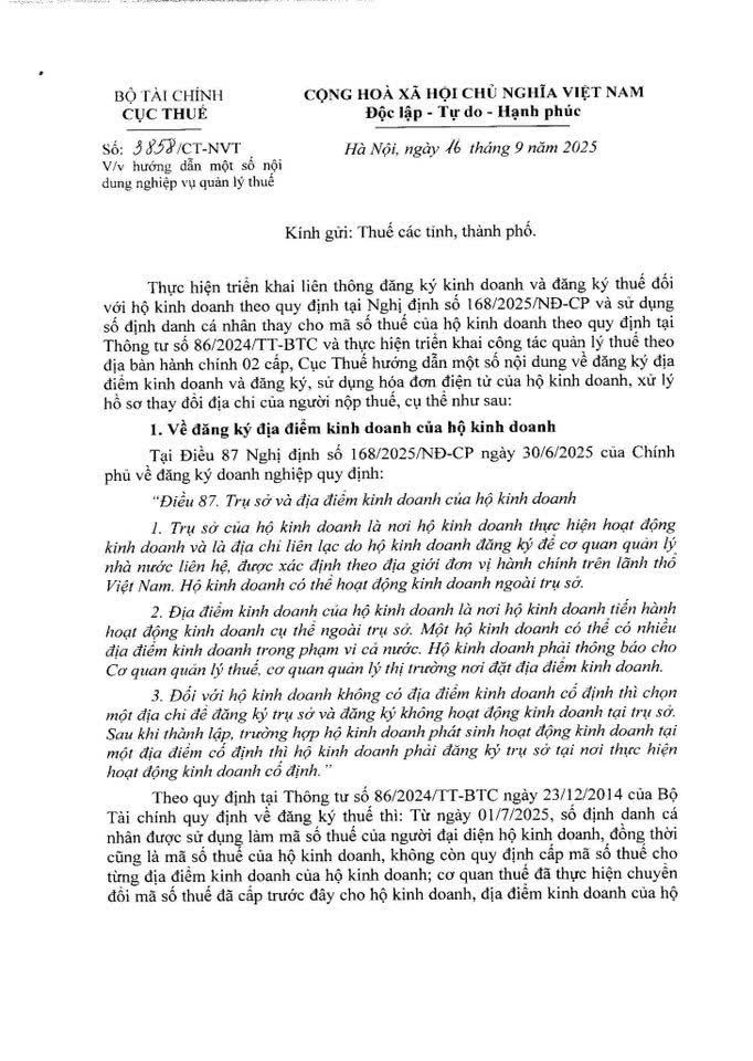 – Từ ngày 01/7/2025, số định danh cá nhân của đại diện hộ kinh doanh được sử dụng làm mã số thuế, không cấp mã số thuế riêng cho từng địa điểm.