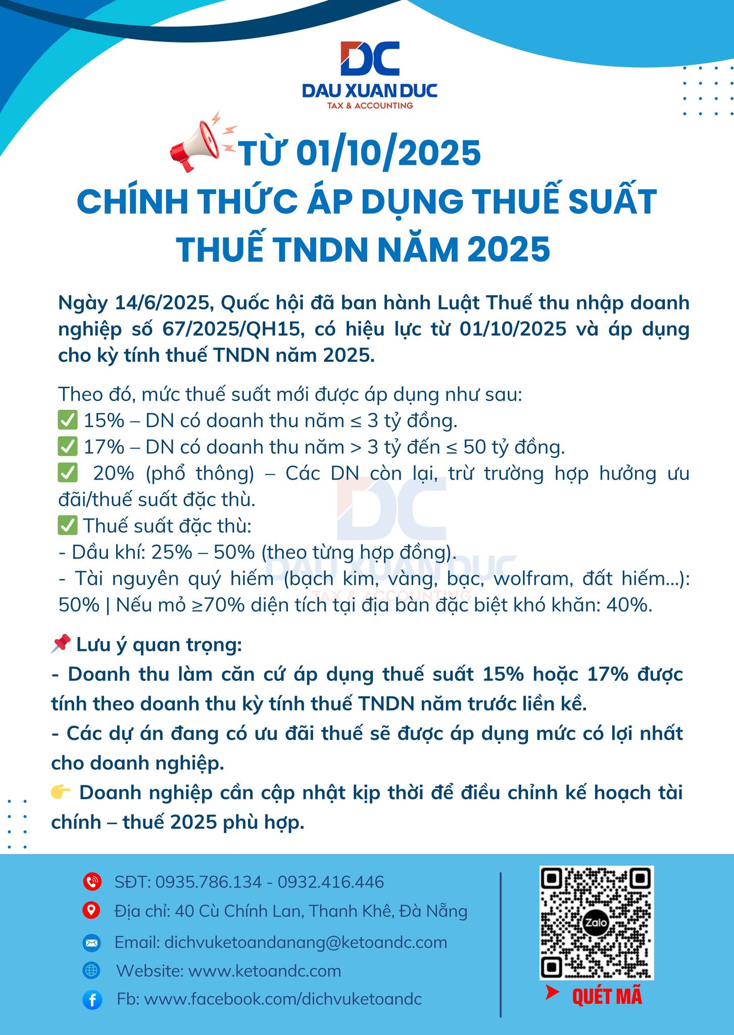 Ngày 14/6/2025, Quốc hội đã ban hành Luật Thuế thu nhập doanh nghiệp số 67/2025/QH15, có hiệu lực từ 01/10/2025 và áp dụng cho kỳ tính thuế TNDN năm 2025.