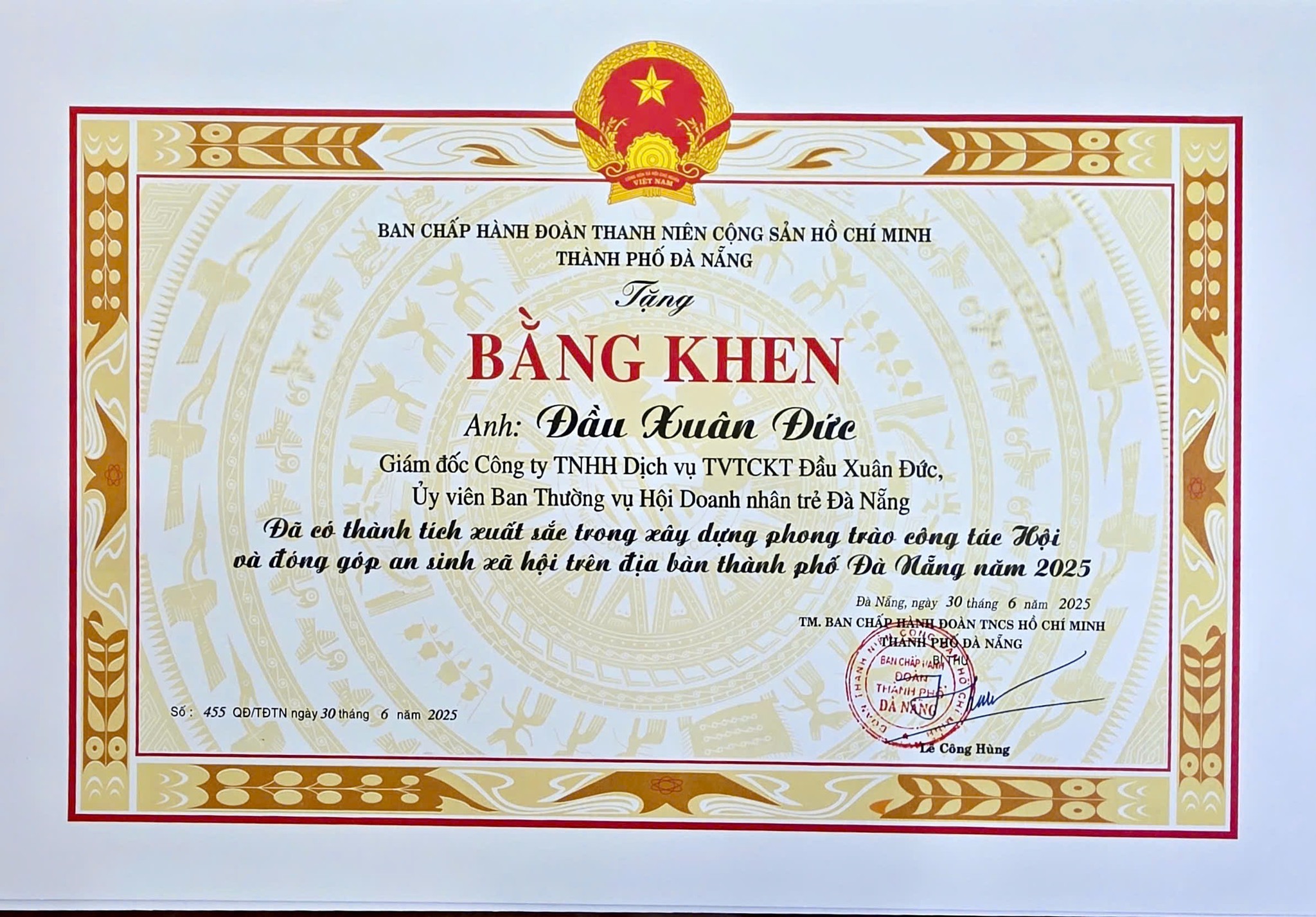 🏅Bằng khen BCH Đoàn thanh niên cộng sản HCM- TP Đà Nẵngcá nhân dành cho Anh Đầu Xuân Đức – Giám đốc Công ty, Ủy viên Ban Thường vụ Hội Doanh nhân trẻ Đà Nẵng, vì đã có thành tích xuất sắc trong xây dựng phong trào công tác Hội và đóng góp an sinh xã hội trên địa bàn TP. Đà Nẵng Năm 2025.